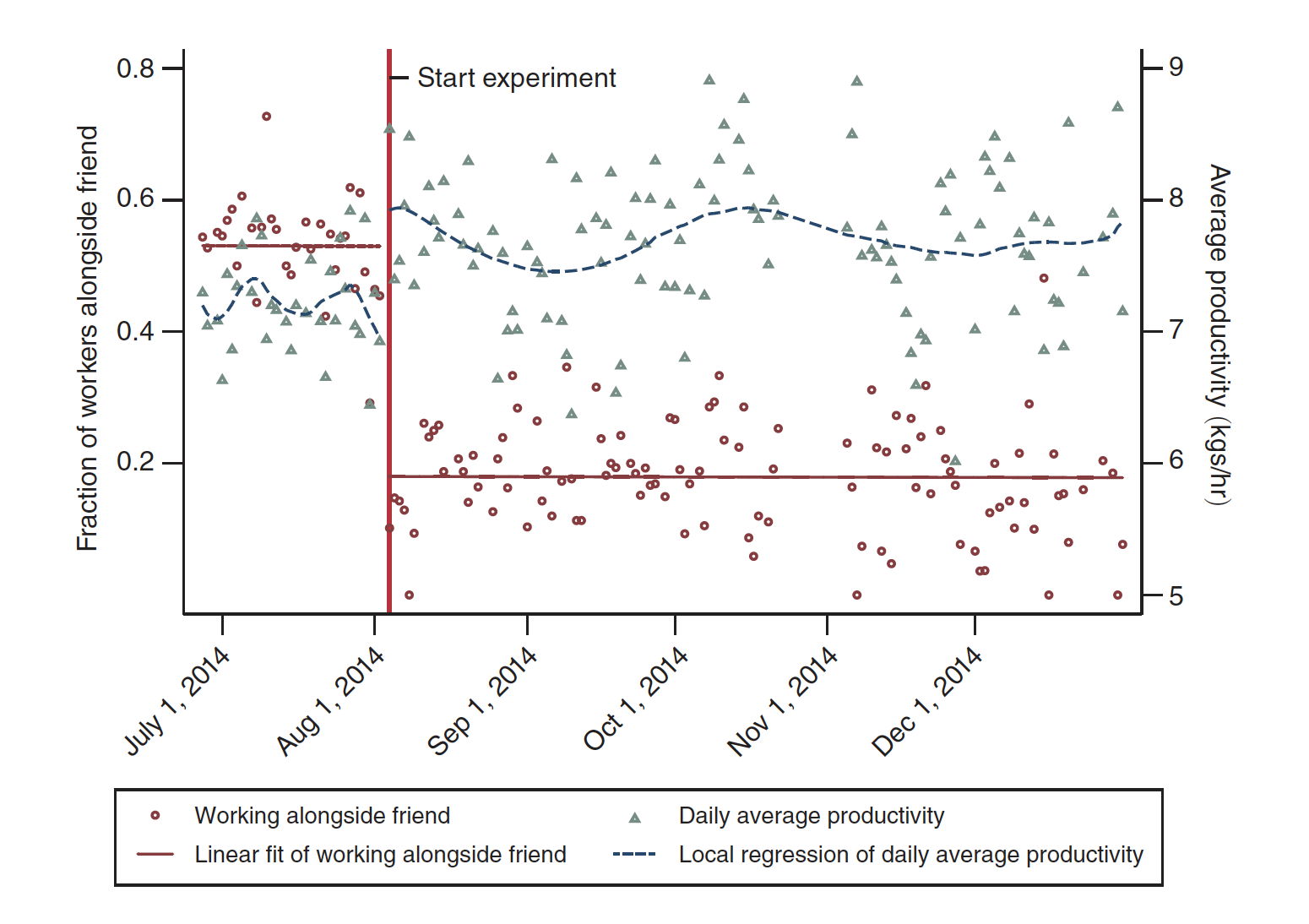 The red circles indicate the share of employees working alongside a friend each day (left axis). The blue triangles represent the average productivity—kilograms of filleted fish per hour—at the plant each day (right axis).