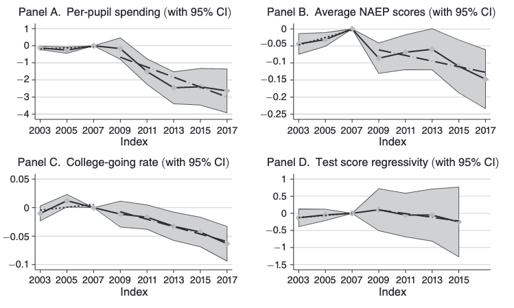 A paper in the American Economic Journal: Economic Policy examines the impacts of state spending cuts on the educational outcomes for students in K–12 public schools. Authors C. Kirabo Jackson, Cora Wigger, and Heyu Xiong found lasting ill-effects on test scores and college enrollment, particularly in states where schools rely more heavily on state aid.