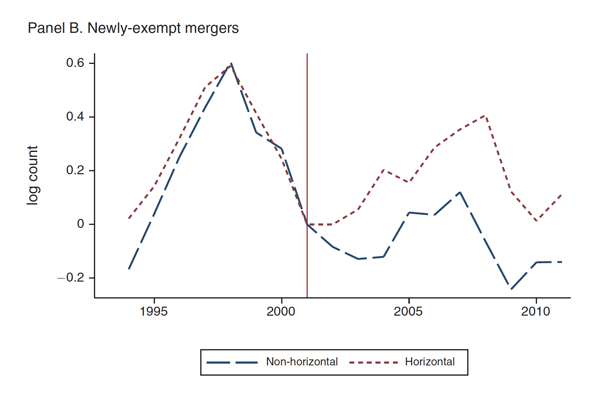 After the change, notifications and investigations of newly-exempt mergers dropped immediately and dramatically.