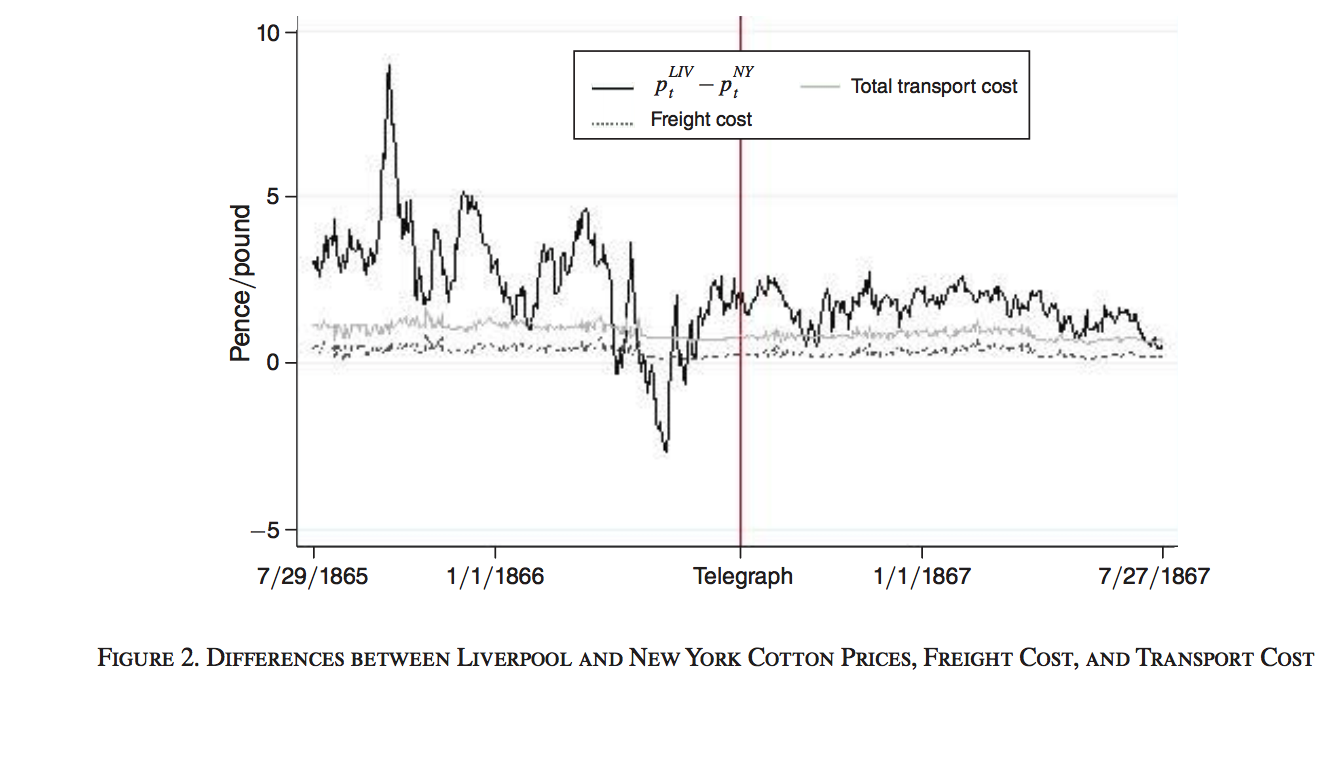 Before the telegraph cable existed, steamships relayed cotton price information between New York and Liverpool — about a ten-day voyage. With the telegraph, Americans could use up-to-date information about Britain to better forecast demand and determine how much cotton to export. This led to fewer shortages and surpluses, which translated into more consistent prices.