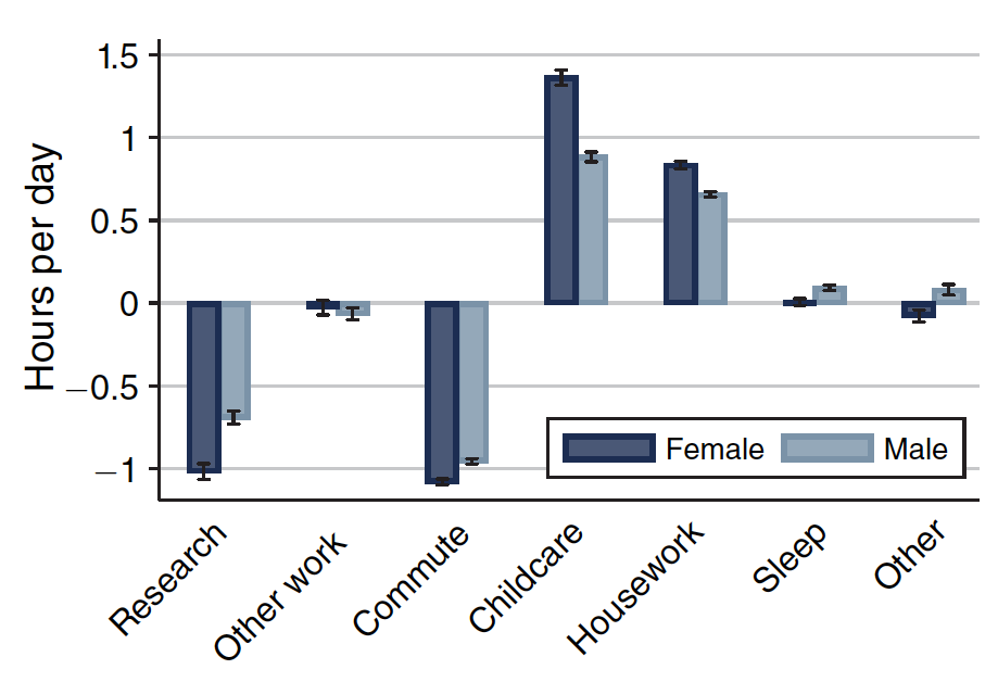 Researchers Tatyana Deryugina, Olga Shurchkov, and Jenna Stearns investigated the disproportionate effects of COVID-19 disruptions on female scholars. They examined survey data from 19,905 respondents with doctoral degrees, asking them to estimate the average number of hours spent on research and other tasks before and after the pandemic began. Read more.