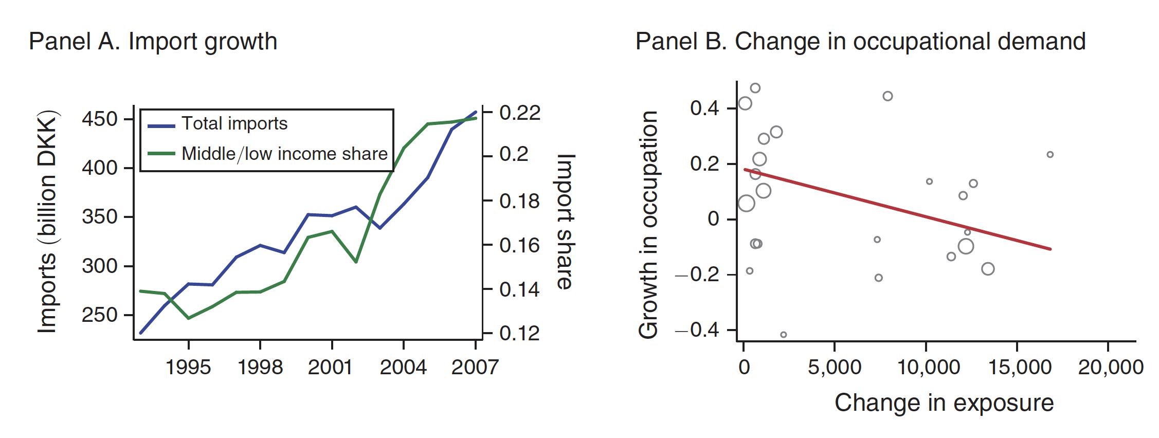 Panel B shows how exposure to import competition varied with the logarithmic change in the number of jobs for an occupation. (The size of the circles represent the size of the occupations.)