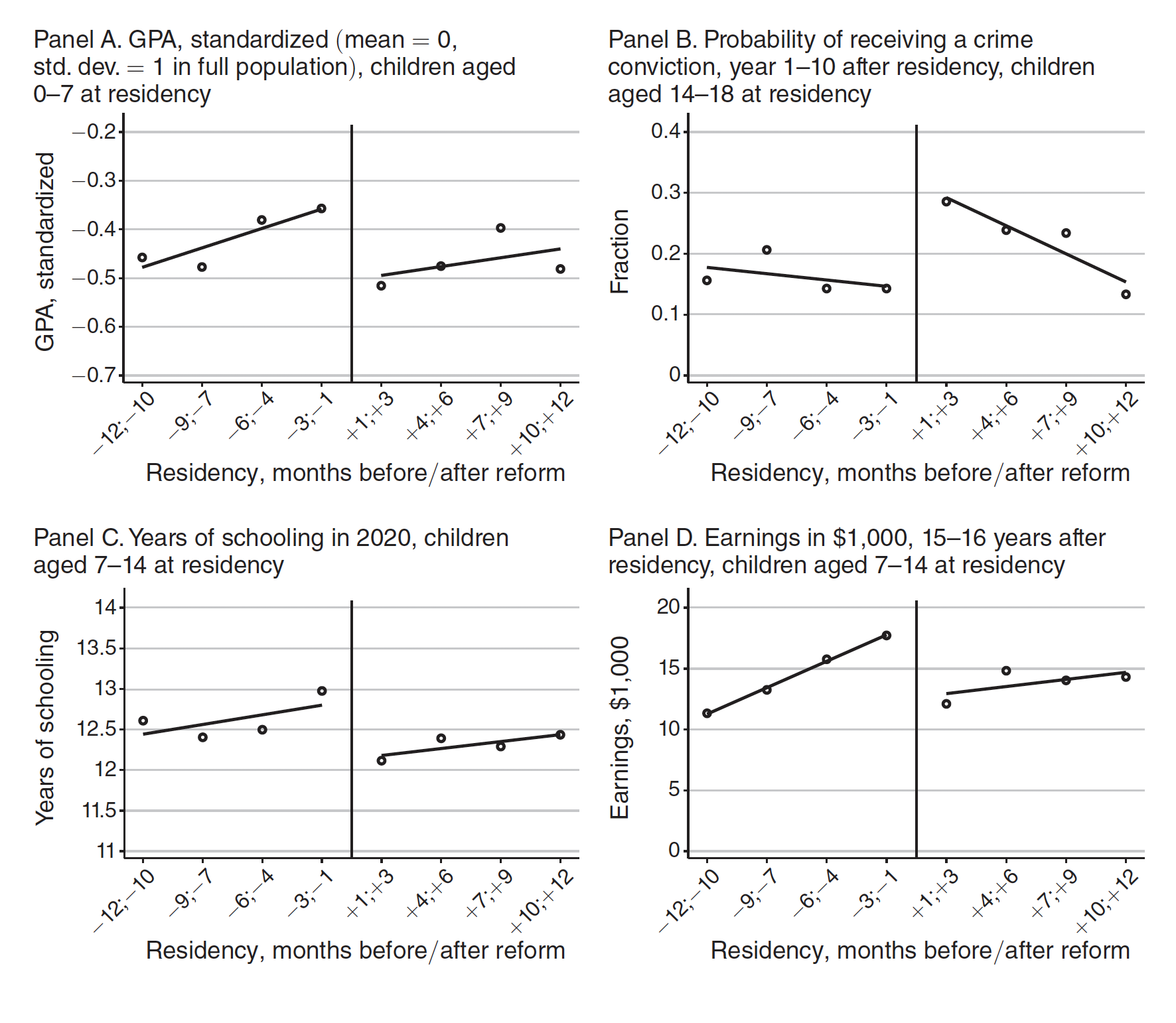 Panel A plots the standardized GPA of refugees who were 7 years old or younger when they gained residency. Panel B plots the fraction of teenage refugees who had a criminal conviction some time in the first 10 years after they gained residency. Panel C plots the average years of schooling in 2020 for refugees who gained residency when they were 7 to 14 years old. Panel D plots the average earnings (in thousands of US dollars) of refugees 15 to 16 years after gaining residency when they were 7 to 14 years old. (The solid black lines are lines of best fit before and after the welfare cuts.)