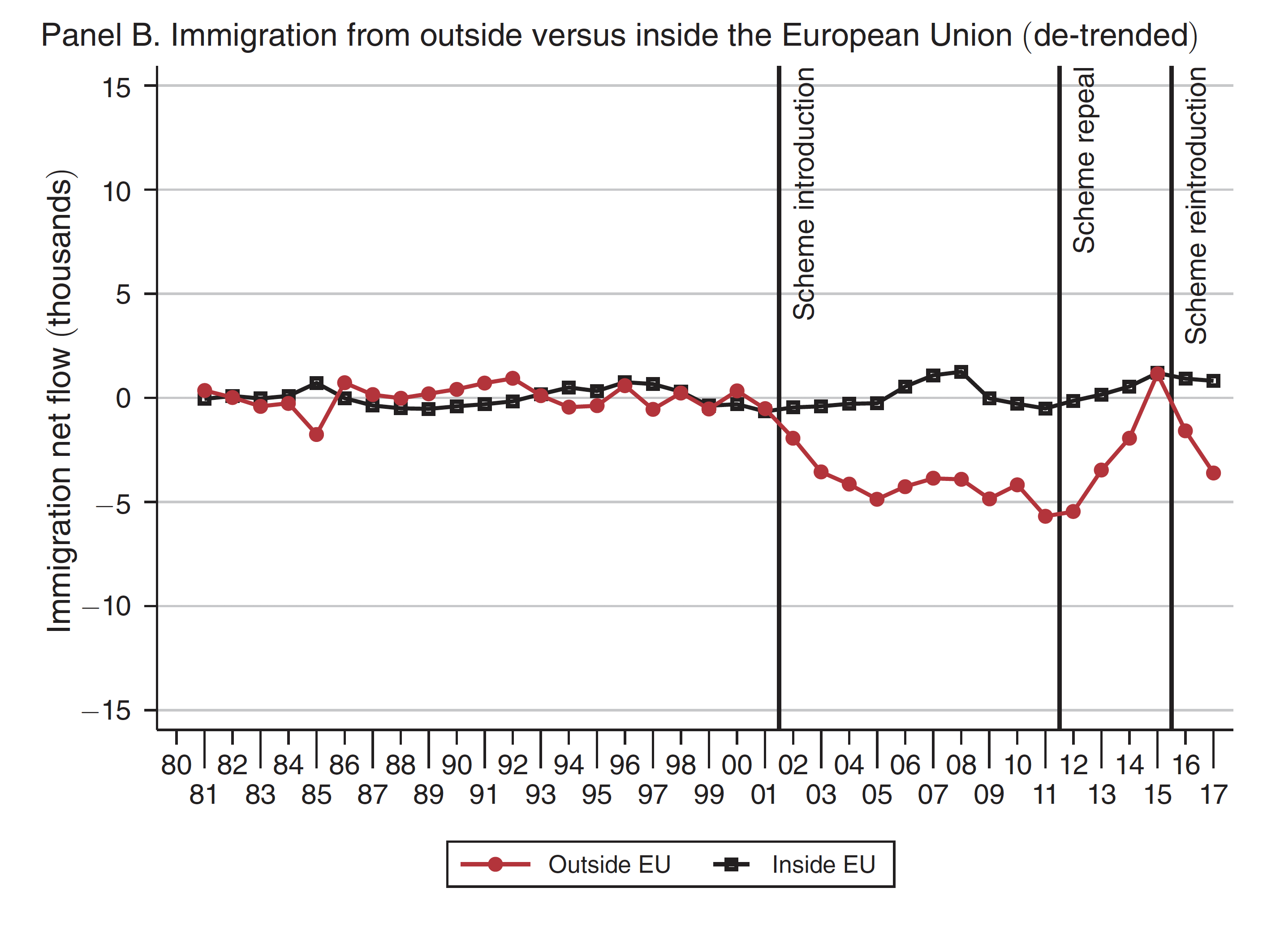The black line shows net immigration flow from places inside the EU, whose citizens received full welfare benefits throughout the period. The red line indicates the flow into Denmark from outside the EU. (The linear trends were removed in both series to ease comparison.)