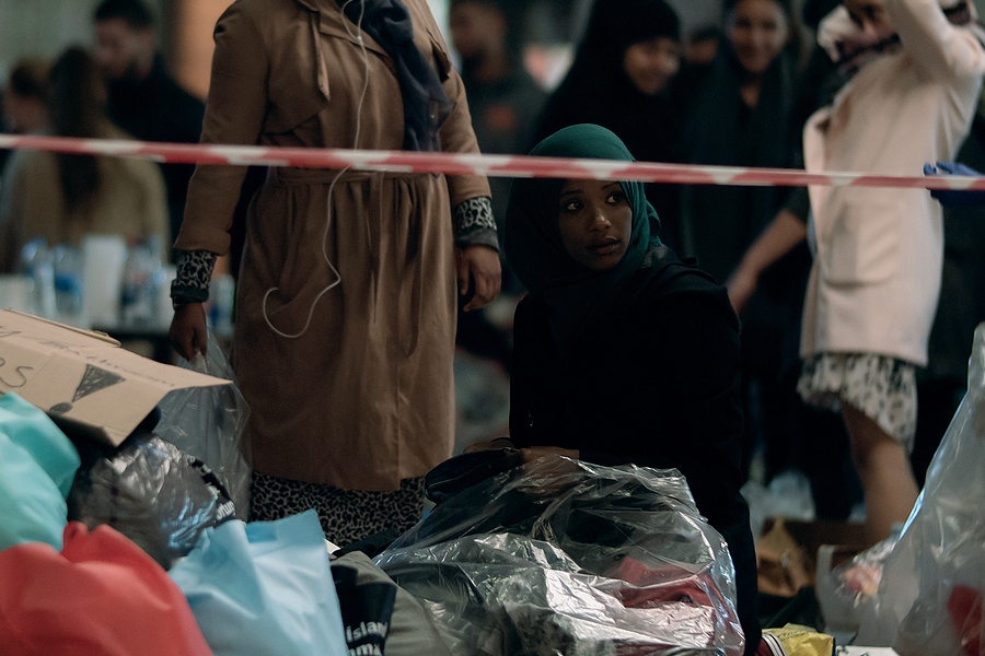 A Syrian refugee sits at a charity collection point in Copenhagen.