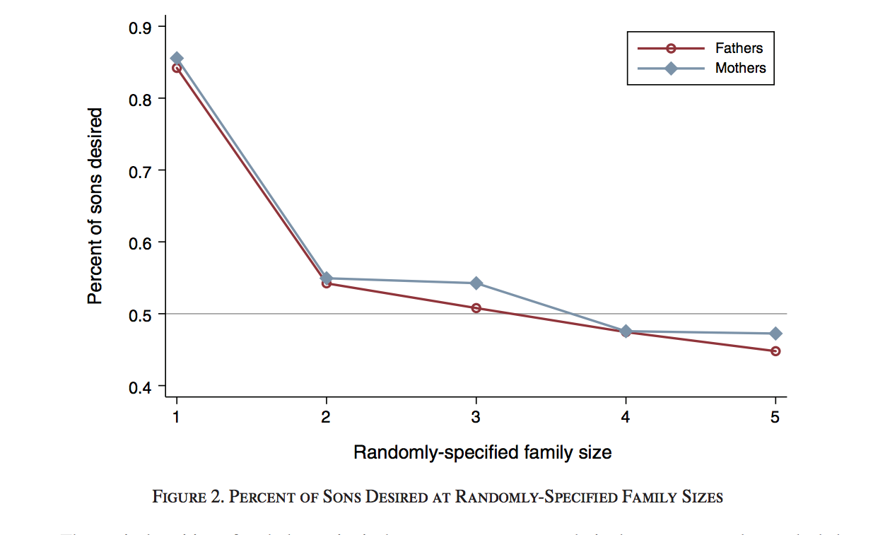 Jayachandran surveys parents in Haryana, a relatively prosperous state in north India, about preferred outcomes for their children's families. For a given family size (ranging from one child to five children), the parents are asked to state their preferred mix of boys and girls. The chart above shows that when these parents are asked to imagine only-child households, they strongly prefer boys, even though the desired mix of boys and girls is basically even in hypothetical families larger than that.
