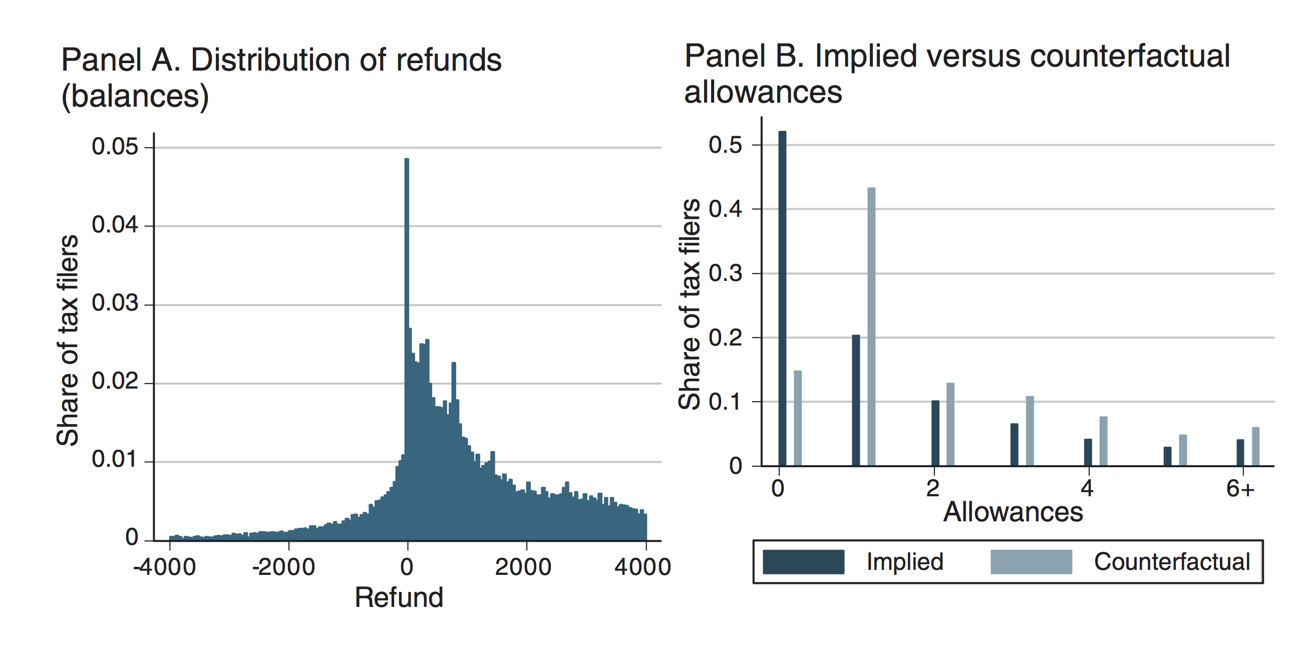 Panel B of the figure above shows a disconnect between the exemptions people claim on their W-4 forms according to tax data analyzed by Jones (Implied, dark blue), and the exemptions they would claim if they had followed the form’s instructions to the letter (Counterfactual, light blue). People tend to claim fewer exemptions than recommended, which results in more tax withholdings, smaller paychecks, and eventually bigger refunds.