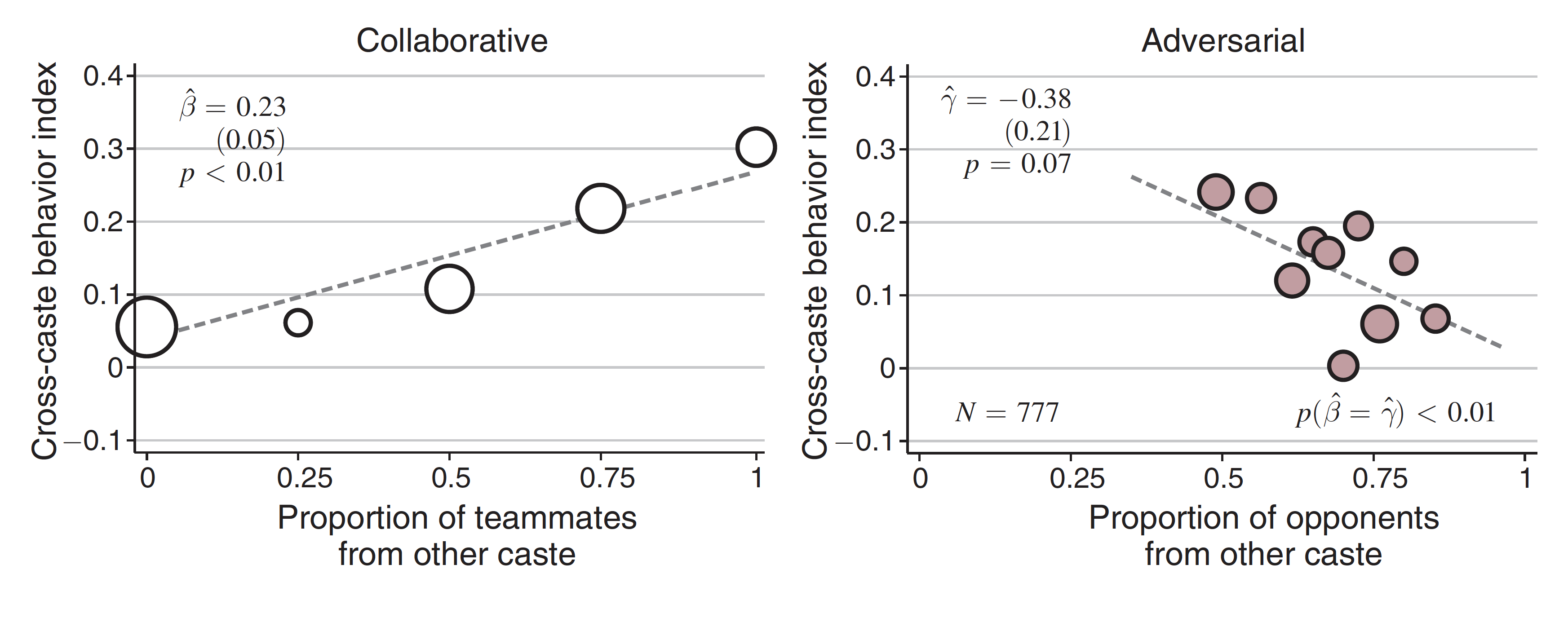 The contact hypothesis also indicates that members need equal status within the group to facilitate positive integration. But even though lower castes were measurably worse at cricket on average and were less likely to be selected as captains—even after controlling for ability—the effects of collaborative contact were similar for upper and lower castes.