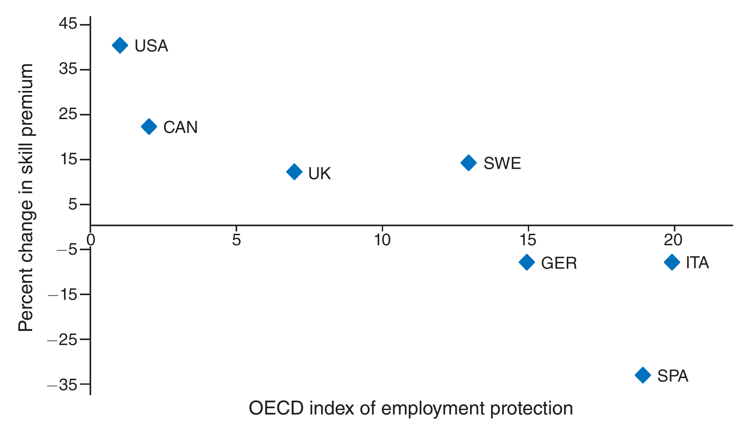 “When we correlate these measures with the change in the skill premium, we find a negative correlation between the two,” Gaetani told the AEA in an interview. “So economies with much stricter laws that protect employment experience a significantly lower increase in the college premium. This basic correlation is what got us motivated in the first place.”