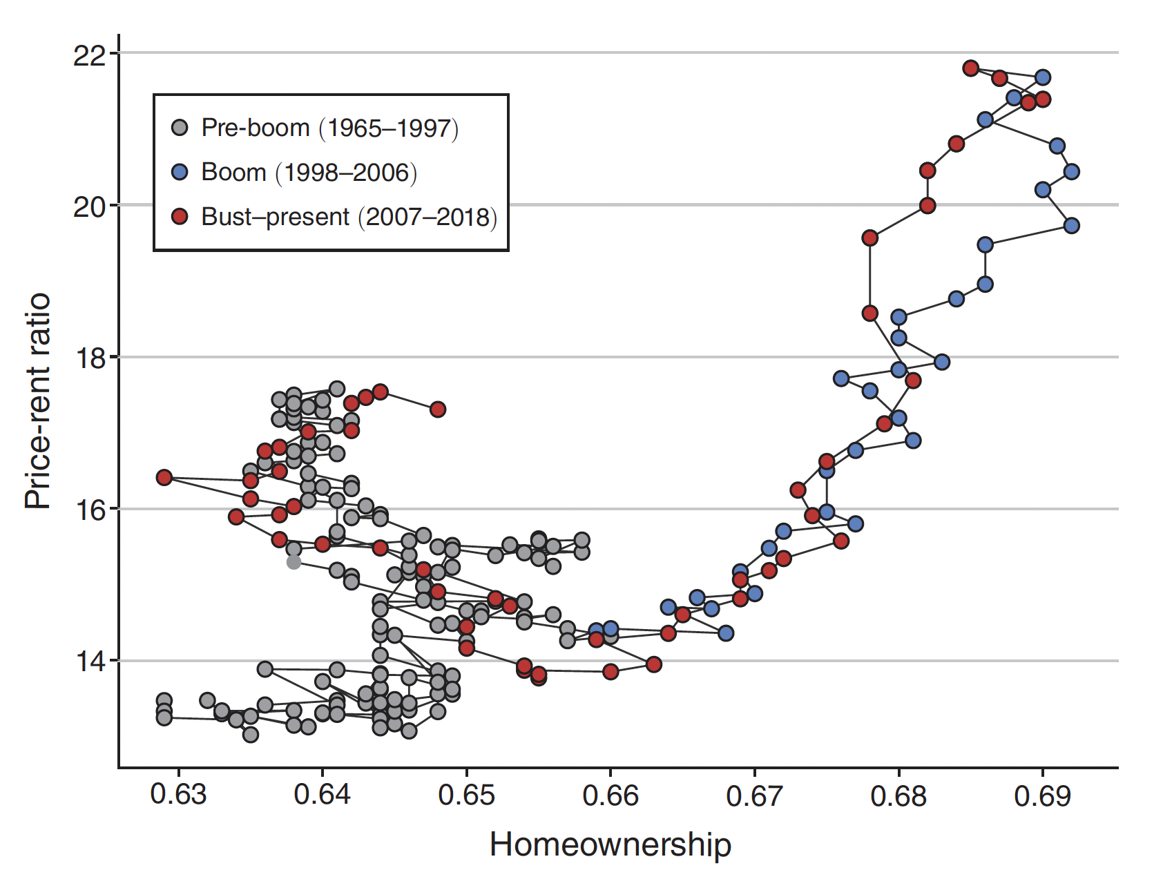 First, the authors examined the response of price–rent ratios and homeownership rates to credit supply shocks. They observed that the relative magnitude of these two responses reveals the slope of what they term the "tenure supply curve," which captures how willing landlords are to sell rental properties as prices rise. A steeper curve indicates a more inelastic supply—and hence strong segmentation—while a flatter curve indicates a more elastic supply—suggesting a more frictionless market.