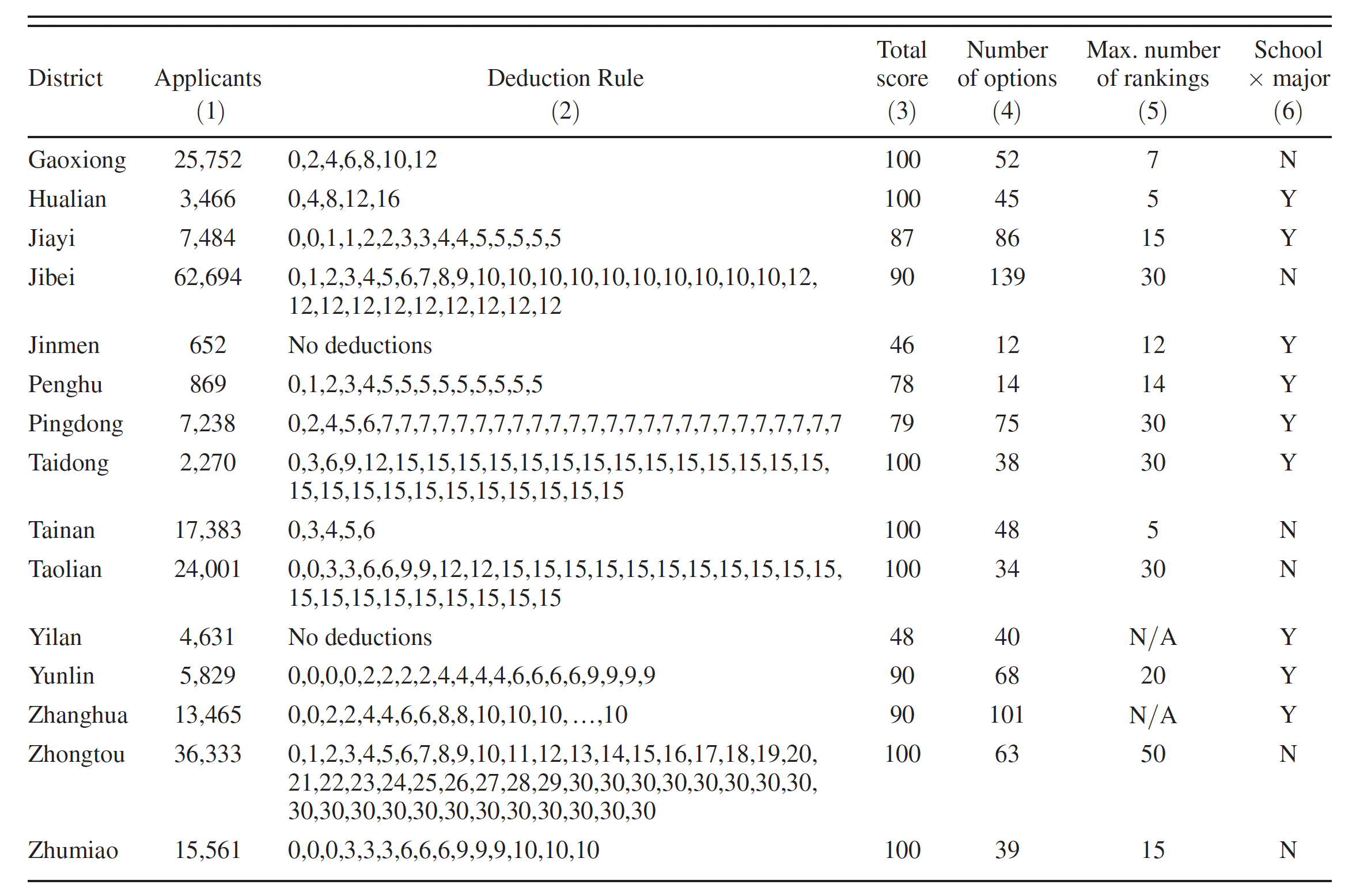 The system sorts Taiwanese students entering high school based on their scores on a Comprehensive Assessment Examination. Students then rank their preferred schools. However, depending on the school district, the lower a student ranks a school, the more points are deducted from their admission score.