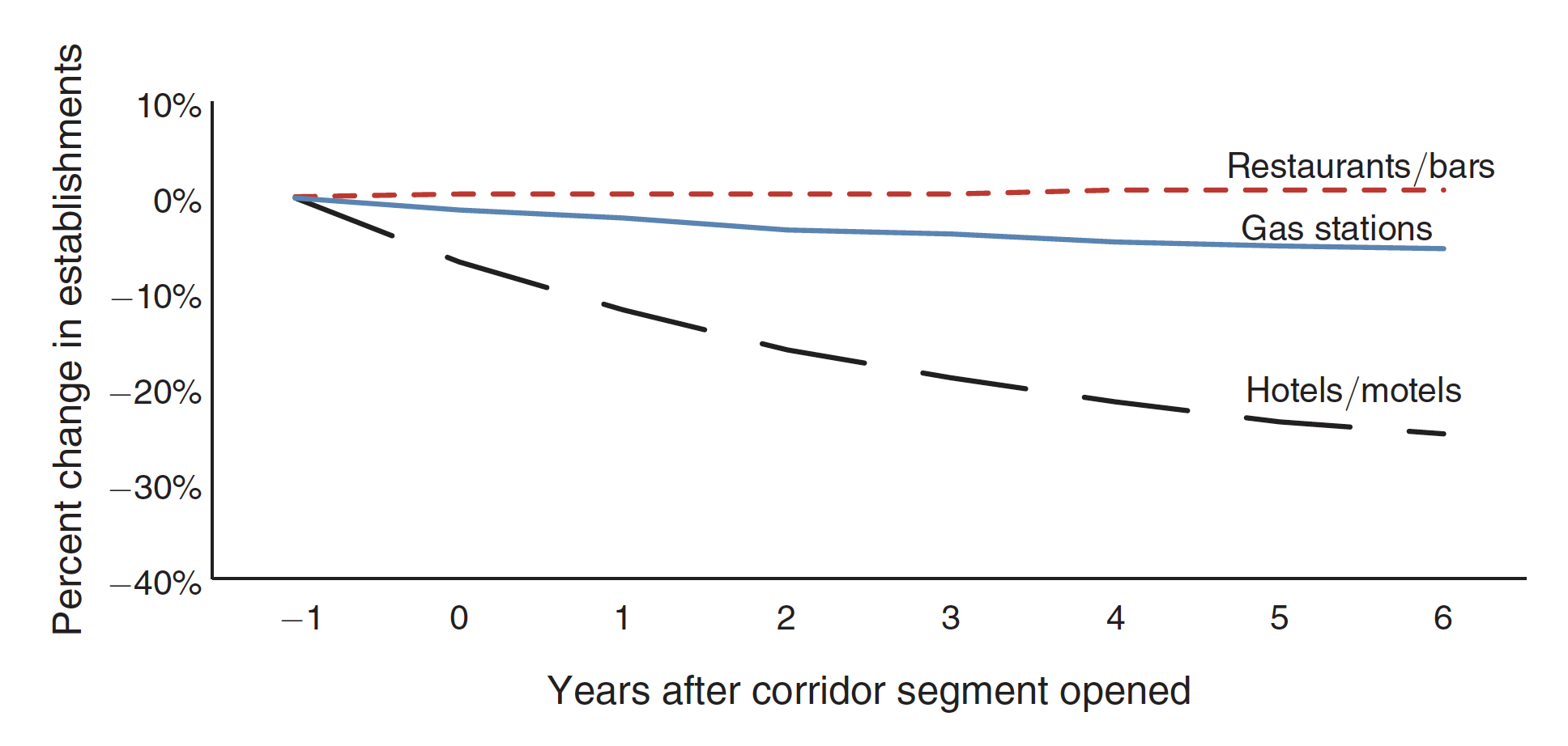 Importantly for the researchers’ quasi-experiment, not all the highways were completed at the same time. They isolated the time and place of these local booms by comparing counties before and after an interstate opened.