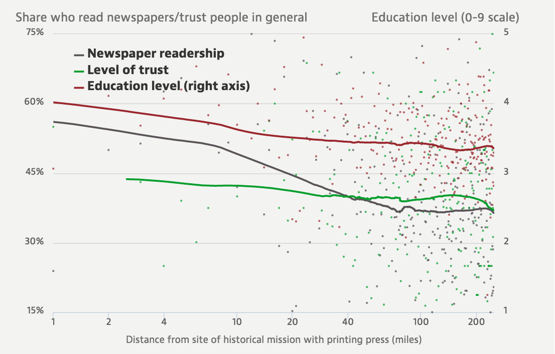 The authors measure the relationship between proximity to a historic printing press site and indicators of social capital, like education level, newspaper readership, trust, and participation in elections. Using a large set of geographic, historical, and demographic controls, they find that living 1% farther away from a historical printing press site was associated with a 2.5 percentage point decrease in newspaper readership and a 3.6 percentage point decrease in trust, as measured by responses to the question “do you trust people in general?” Proximity to a printing press was also linked to higher levels of education and (in democratic countries) political participation in voting and public marches.