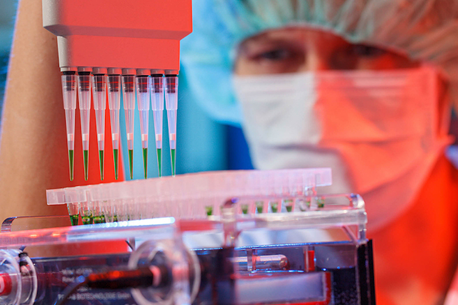 A laboratory technician loads a PCR plate for DNA analysis.