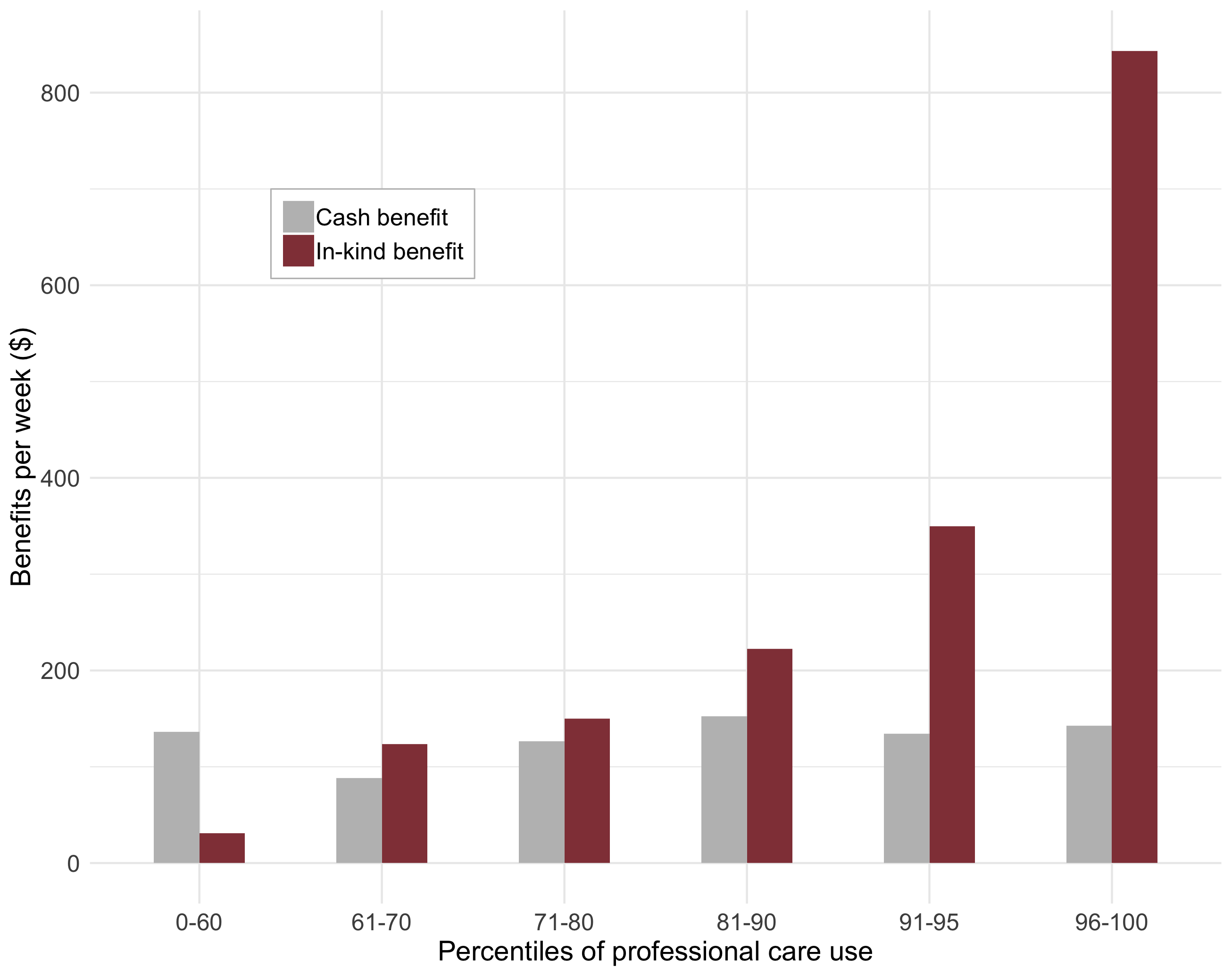 In short, cash assistance spread resources thinly among most eligible recipients, and in-kind support largely zeroed in on the group who needed the most professional care. More than half the people in the in-kind program didn’t use any professional care at all, but likely would have used the cash for informal home care.