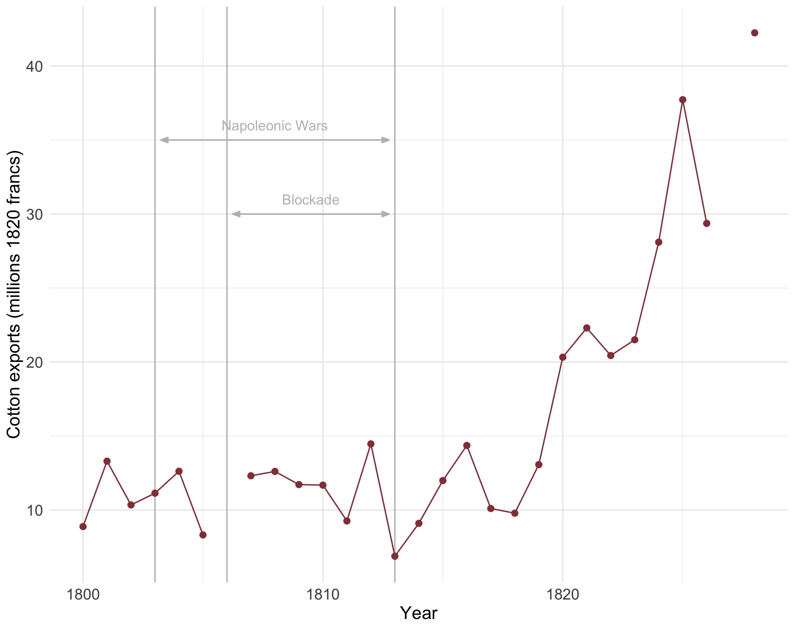 So she looked back further in history, and stumbled upon a natural experiment during the Napoleonic Wars. In the early 19th century, Britain led the Industrial Revolution, and its flagship industry was cotton textiles.