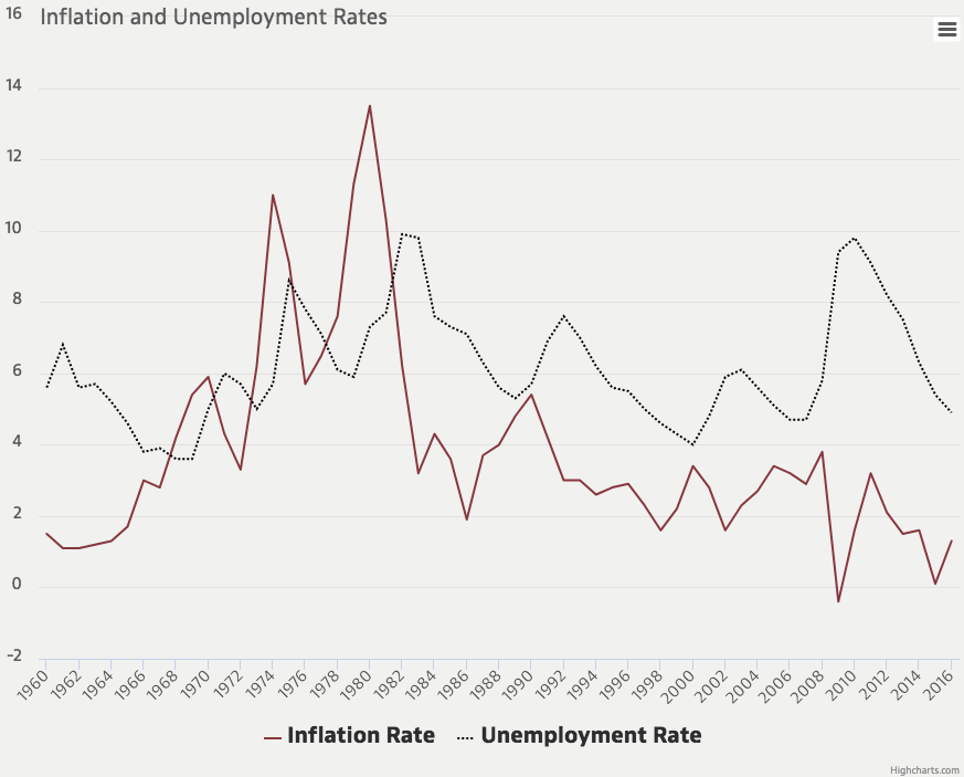 The relationship between inflation and unemployment is known as the Phillips Curve, but it has not been a reliable predictor of inflation over the past decade. Even though unemployment has dropped from ten percent to about four percent since 2009, inflation has not risen.