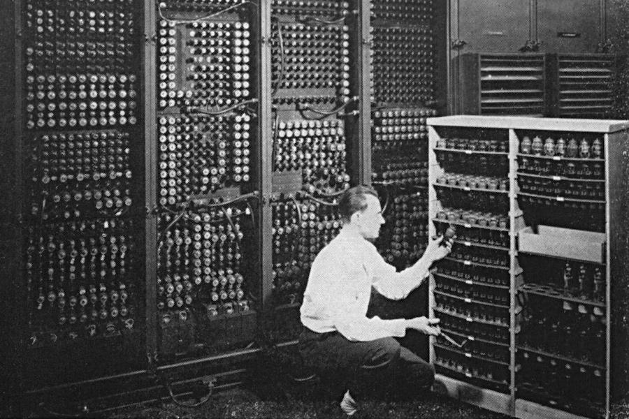 A technician changes a bad tube on the ENIAC, the first general-purpose digital computer, built with government funding.