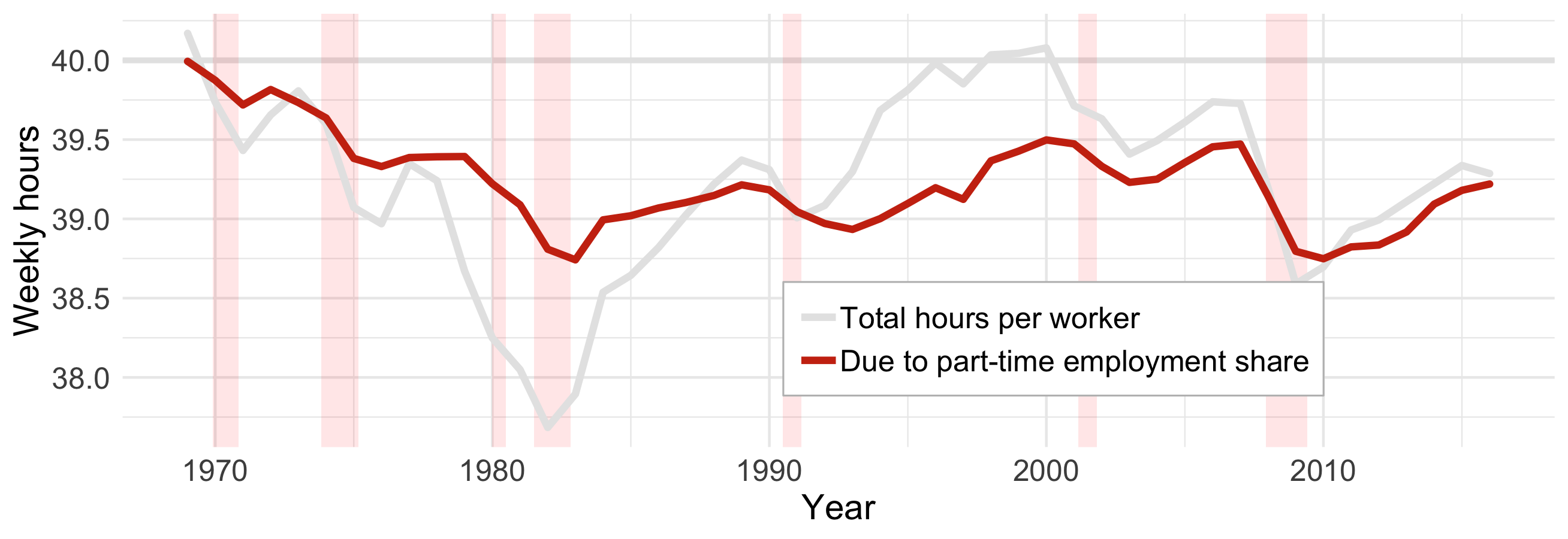 A good portion of that reduction comes from people losing work, but nearly half of the fluctuations in average hours worked could be explained by people moving into part-time positions.