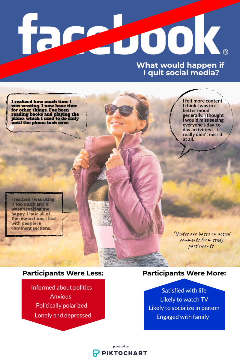 Many of us have fantasized about quitting social media. It’s become the 21st century version of moving to a cabin in the woods. Stories abound online of intrepid souls who’ve gone on a Lenten-style fast from Instagram or Facebook, with mostly positive reports from the frontier. Still, the preponderance of evidence is largely anecdotal.