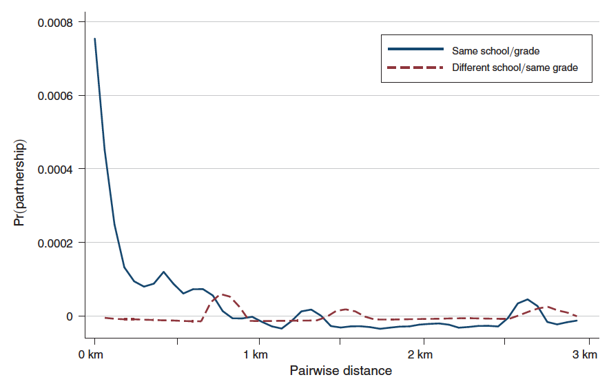 They found that one standard deviation increase in the number of students of the same grade, race, gender, and school who lived within a kilometer of one another increased the probability of arrest by 23 percent. The probability of arrest for violent and property crimes went up by 67 percent and 41 percent, respectively.