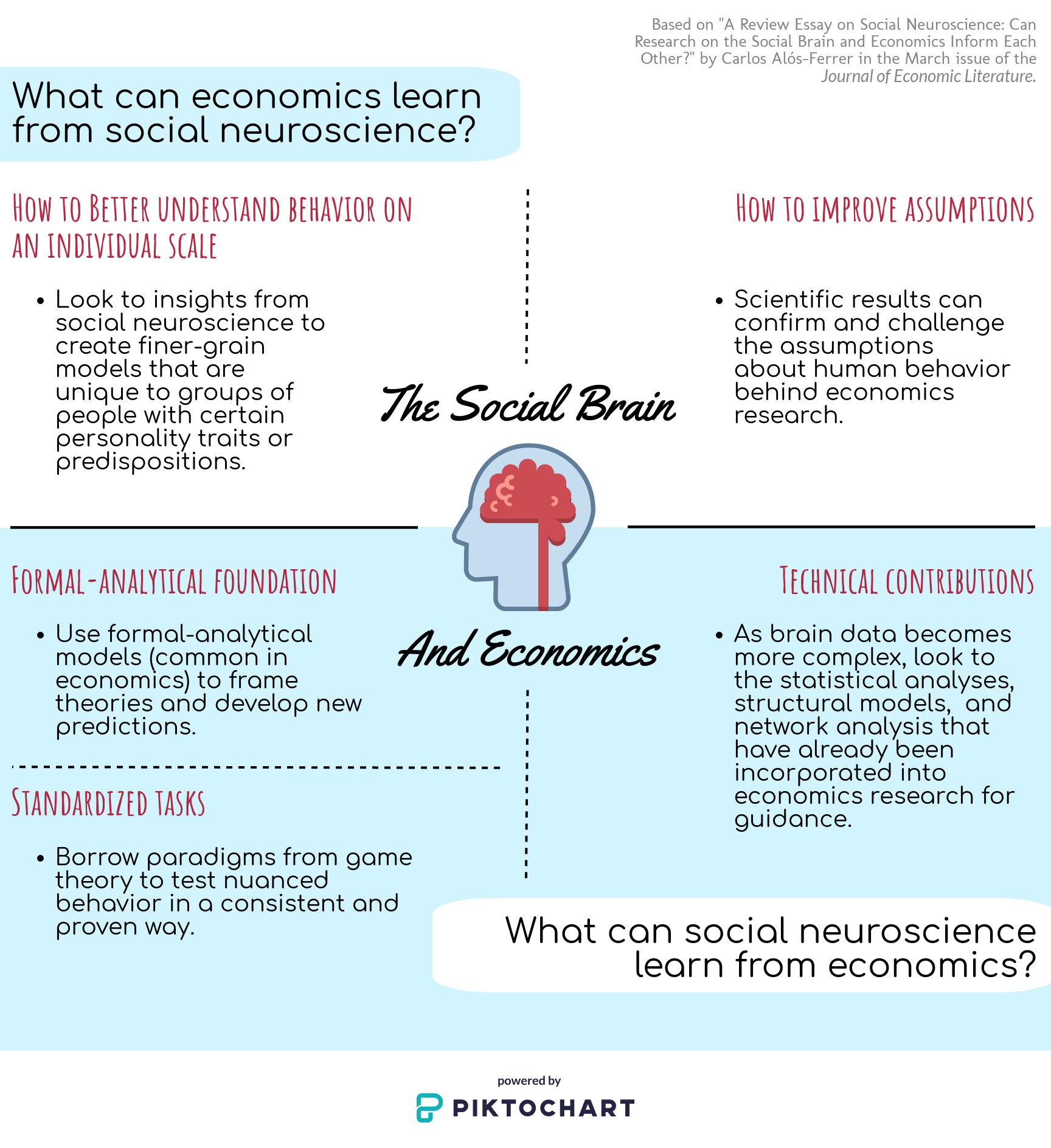 These are only a few of the connections between the fields, and further opportunities for collaboration are promising. Neuroscience and economics have already begun to merge into neuroeconomics, and adding a social dimension to this research will strengthen this growing field.