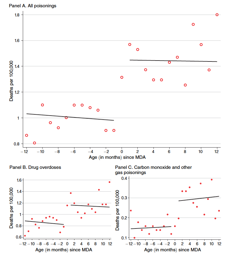 Additionally, they found that poisoning deaths (from drug overdose or gas asphyxiation) rise 29 percent at the minimum driving age, reflecting changes in both suicides and accidental deaths. That effect was overwhelmingly driven by females. Drug overdose deaths among females increased 78 percent and gas poisoning spiked 82 percent.